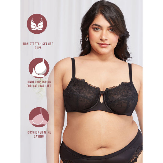 Floral Mesh Underwired Non-padded Lace Bra-NYB221-Black