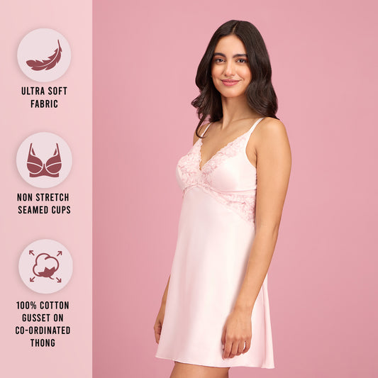 Embroidered Lace and Satin babydoll with Panty-NYS138-Pink (Set of 2)