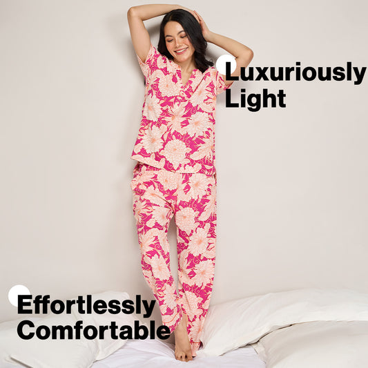 NYKD BY NYKAA BUTTERY SOFT MODAL COTTON PYJAMA COORD SET WITH ROUND NECK GRAPHIC TEE NYS932 PINK