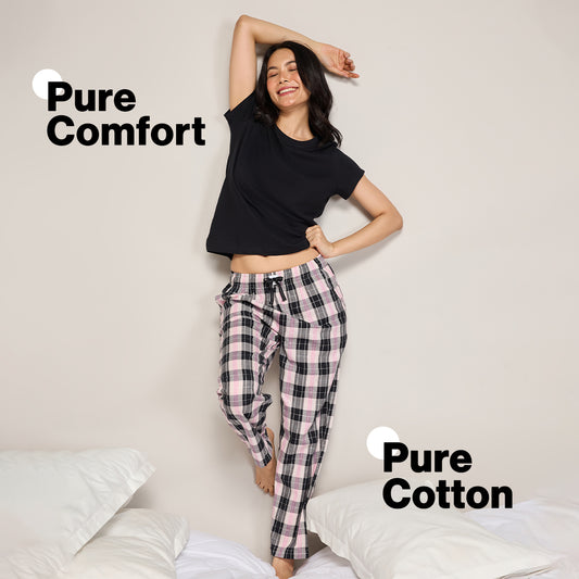 Nykd By Nykaa Essential Cotton Pyjama With Adjustable Elasticated Waist & Pockets Nys141 Black Pink Check