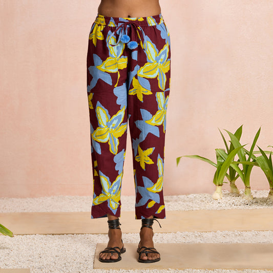 Jodi X Nykd Textured Cotton Tulip Hem Tapered Pants with Pompoms-NYJ04-Blue Floral Print