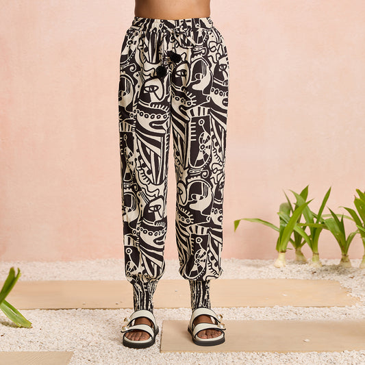 Jodi X Nykd Modal Smocked Comfort Pant with Pompom Tassels-Intertwined Print-NYJ05-Black & White