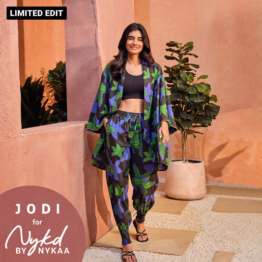 Jodi X Nykd Modal Shrug Jacket with Embroidered sleeves & Smocked Comfort Pant with Pompom Tassels Coord sets-Green Floral Print
