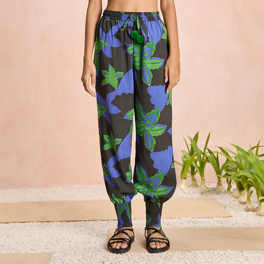 Jodi X Nykd Modal Smocked Comfort Pant with Pompom Tassels-NYJ05-Green Floral Print