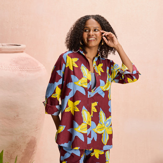 Jodi X Nykd Mangalgiri Cotton Long Shirt with Embroidered Collar & Relaxed Shorts with Pompom Tassels Coord sets-Block Printed Fish Print