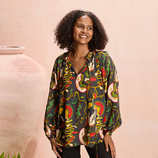 Jodi X Nykd Modal Bubble Sleeve Long Top with Beaded Tassels-NYJ11-Black Plantain Marble Print