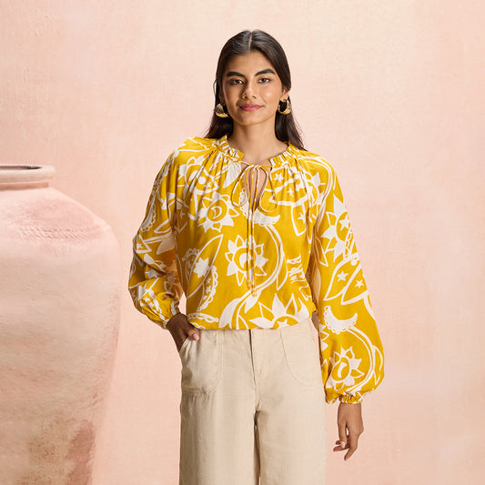 Jodi X Nykd Modal Bubble Sleeve Long Top with Beaded Tassels-NYJ11-Mustard Sun & Moon Print