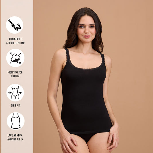 Essential Cotton Stretch Trim Lace Camisole with Adjustable Straps-NYC013-Black