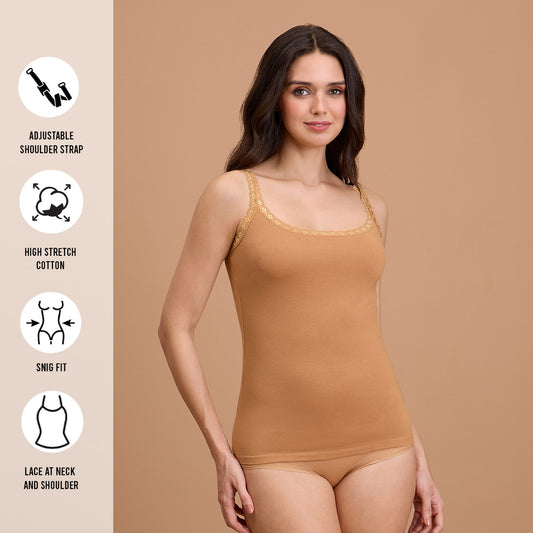 Essential Cotton Stretch Trim Lace Camisole with Adjustable Straps-NYC013-Tan