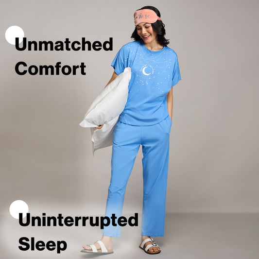 NYKD BY NYKAA BUTTERY SOFT MODAL COTTON PYJAMA COORD SET WITH ROUND NECK GRAPHIC TEE NYS932 BLUE