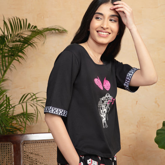 Masaba For Nykd Cotton Half sleeve Teeshirt-Lazy Cow-NYS061-Black