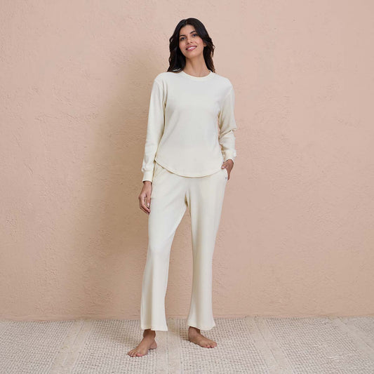 Waffle Lounge Tee with Flattering Hem & Full Sleeves-NYS803-Off White