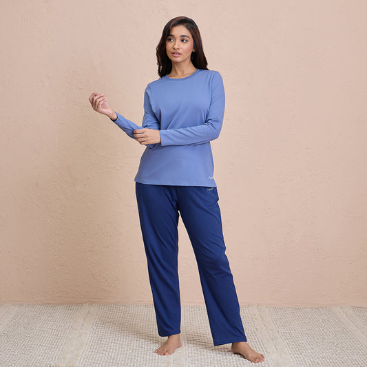 Waffle Lounge Tee with Flattering Hem & Full Sleeves-NYS803-Blue
