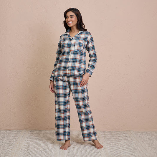 NYKD by Nykaa cozy brushed cotton pajama set of 2-relaxed fit night suit NYS902-Blue & Cream Checks