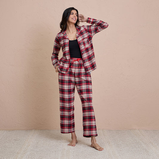 NYKD by Nykaa cozy brushed cotton pajama set of 2-relaxed fit night suit NYS902Brushed Pajama Set with Stylish Button Down Sleep Shirt-NYS902-Red & Beige Checks