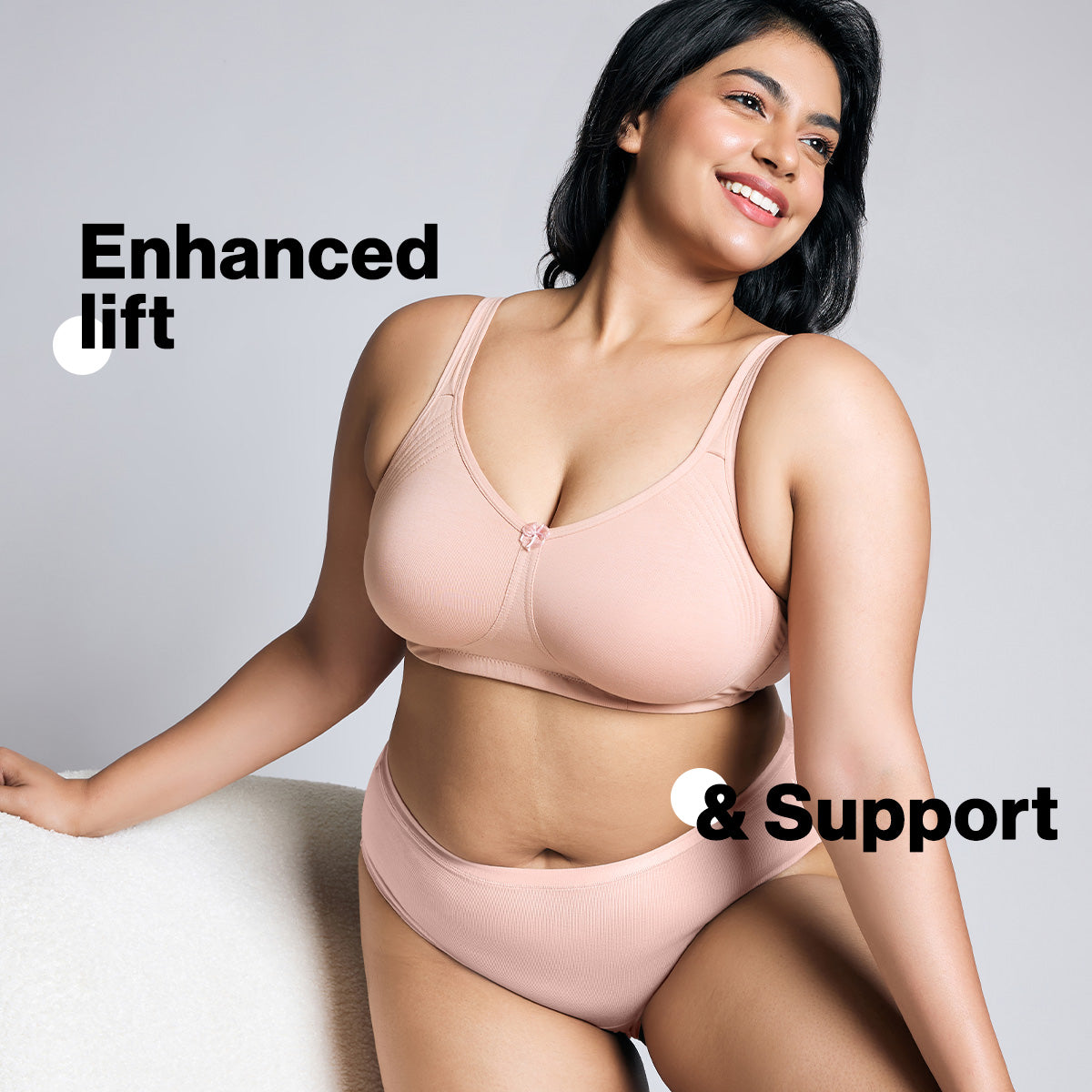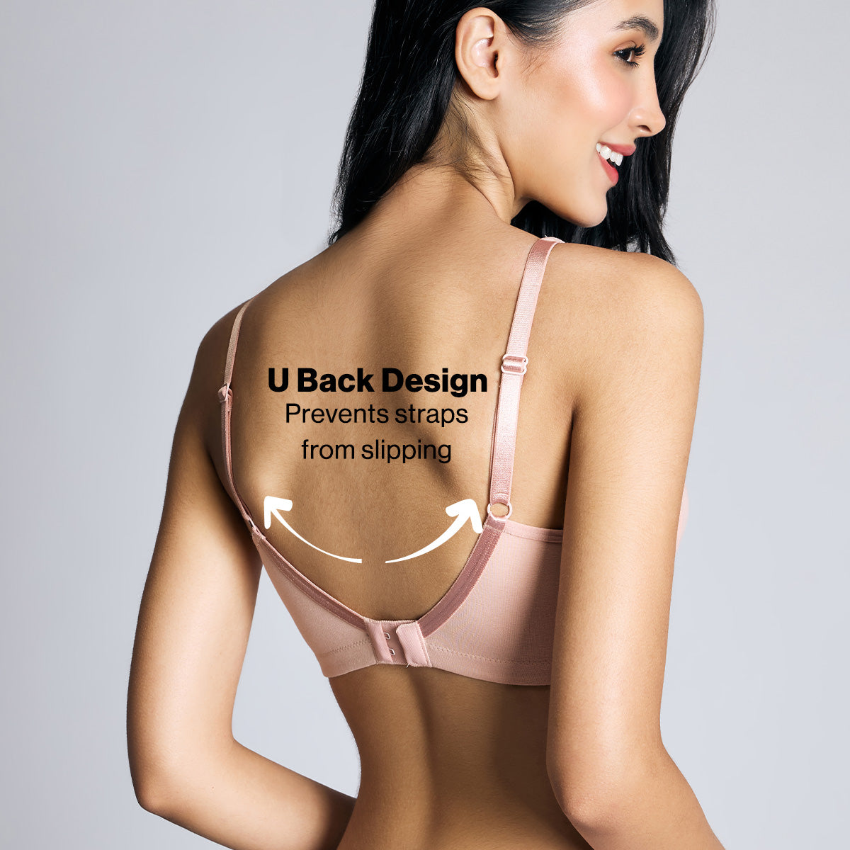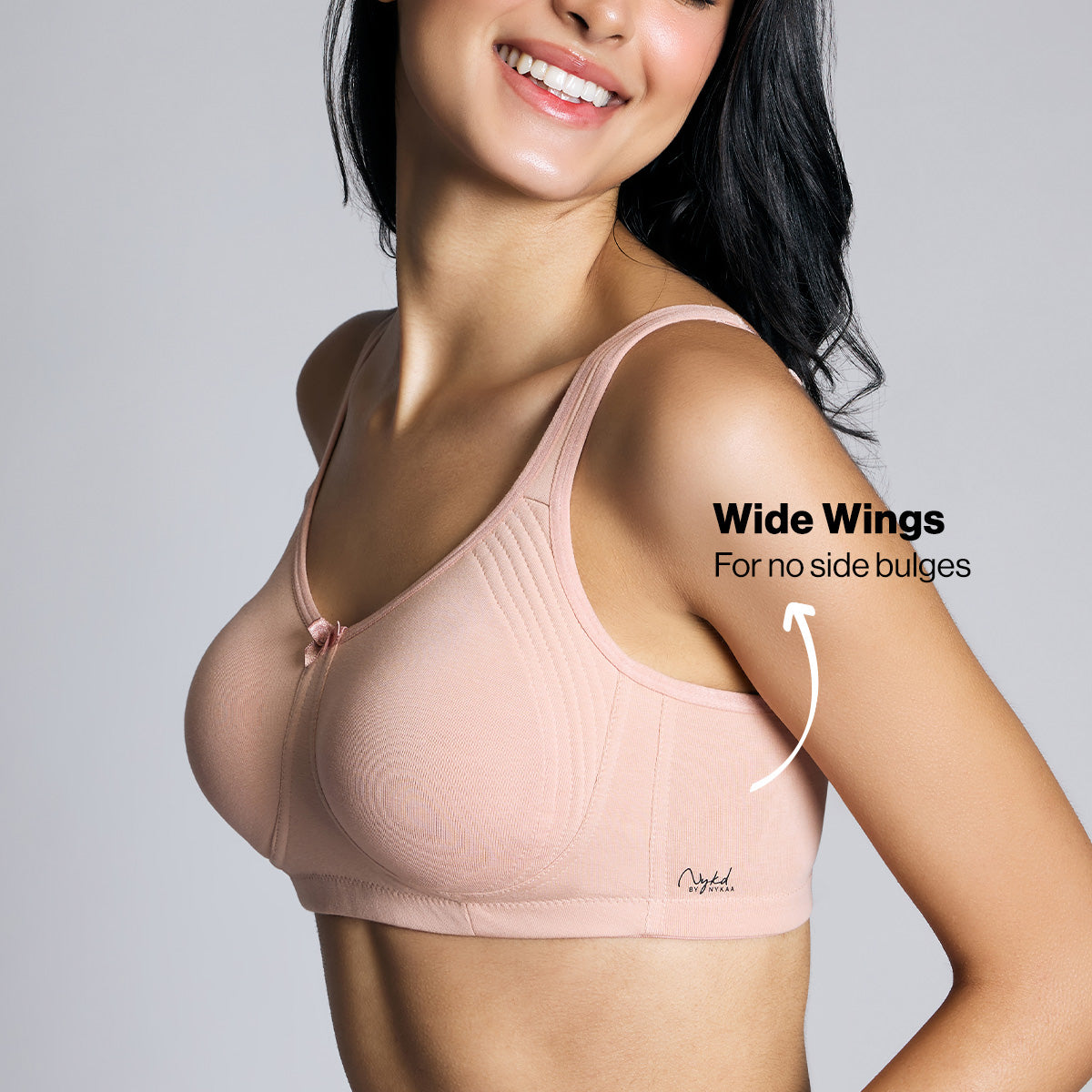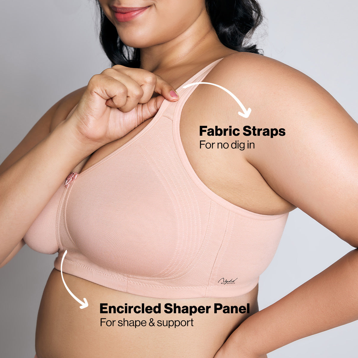 Full Support & Comfort: Side smoothening wings, wire-free design, and fabric straps for a no-dig experience.