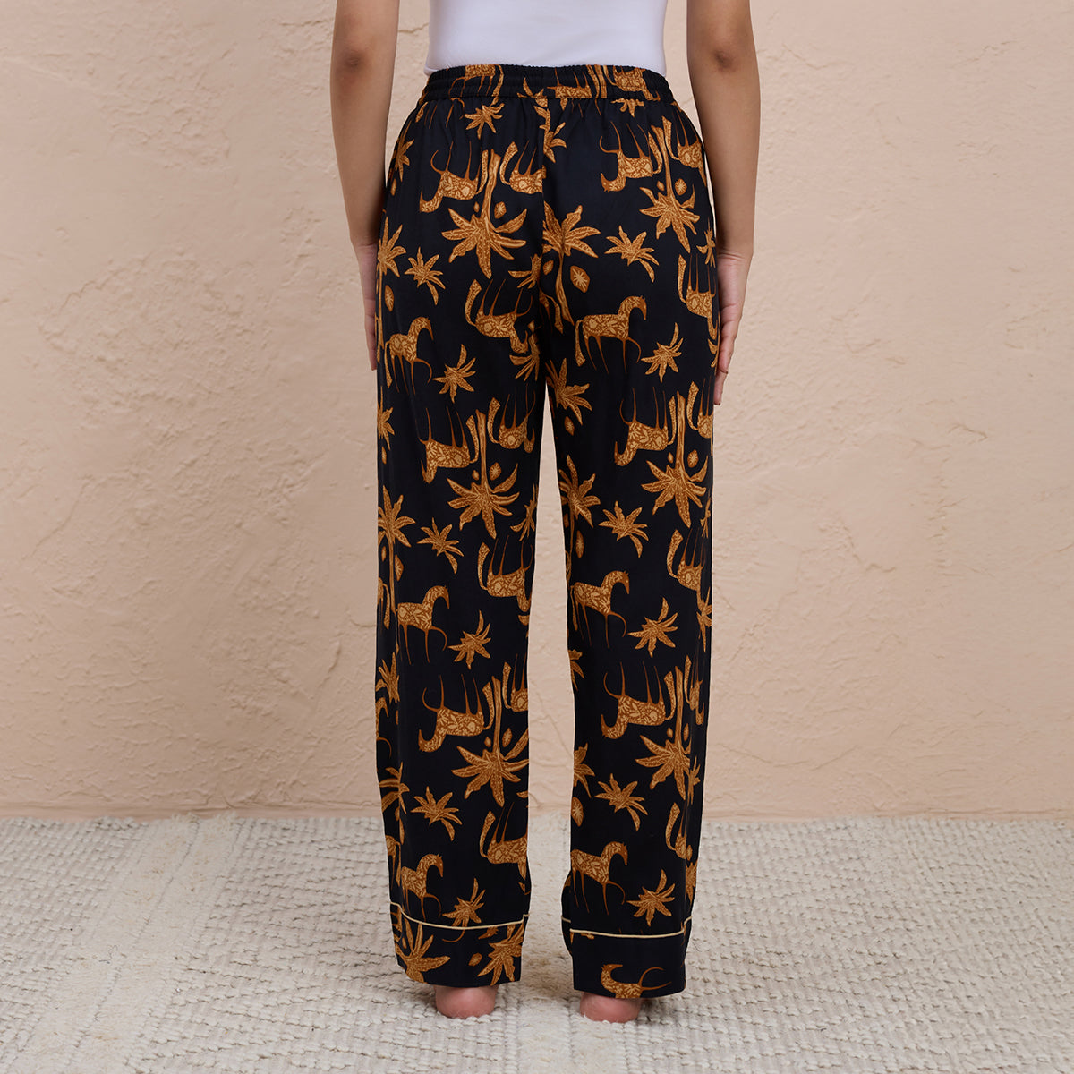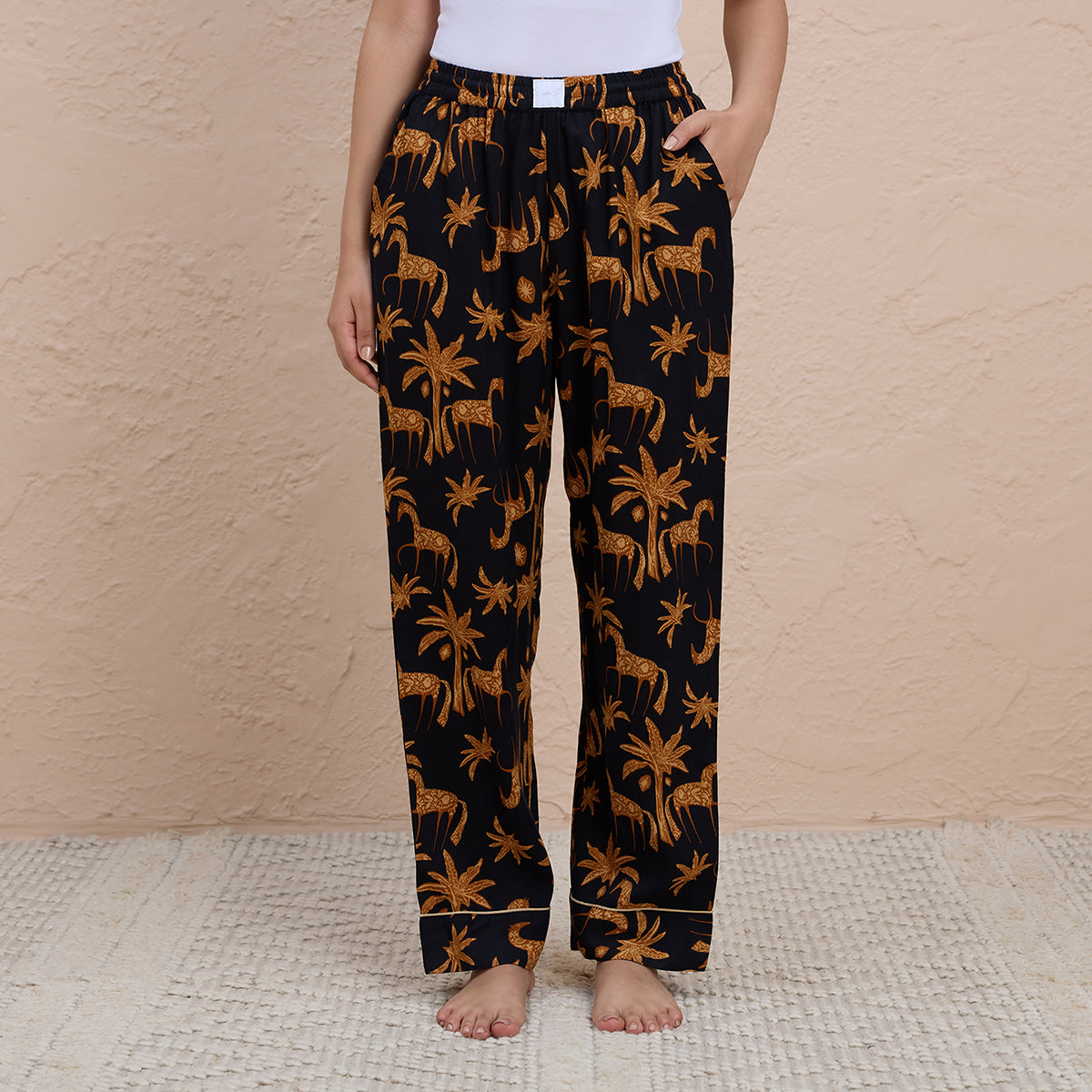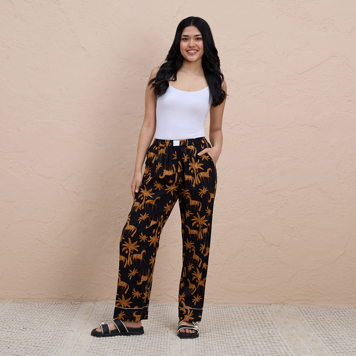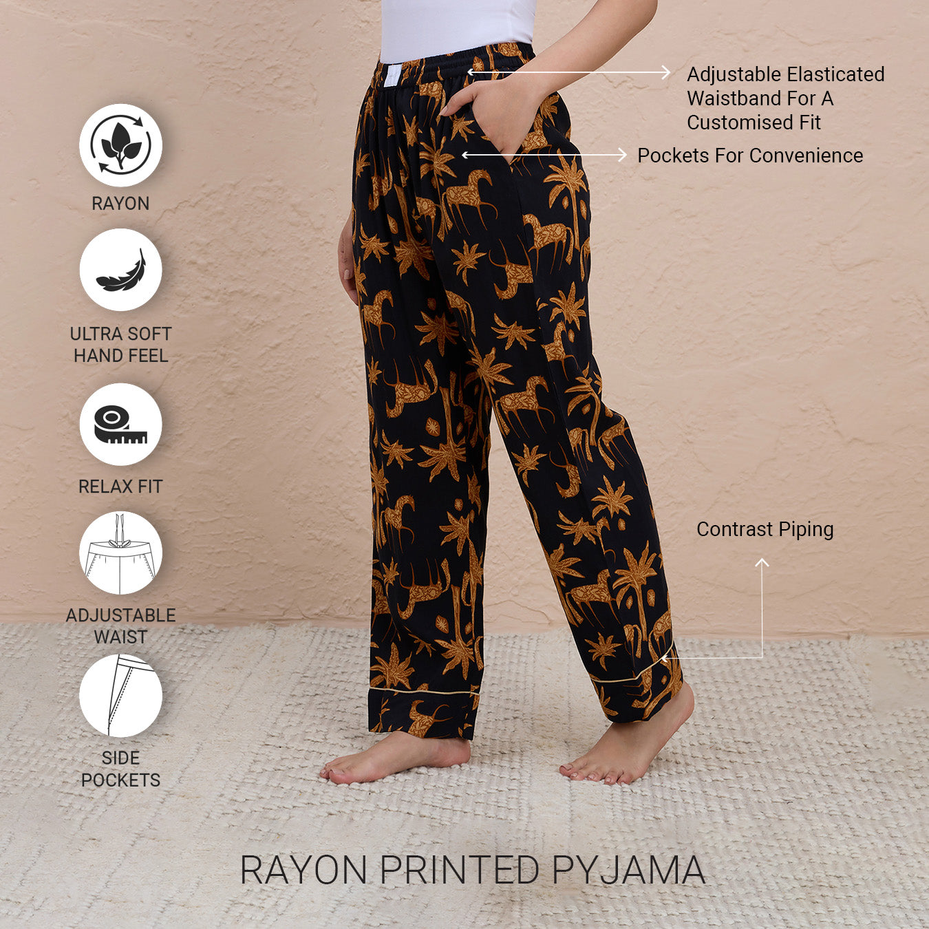 Stay stylish and comfy with these Printed Straight Fit Pyjamas , featuring vibrant seasonal designs and breathable rayon fabric. The relaxed fit, adjustable elasticated waist, and chic contrast piping make them your go-to for effortless lounging.