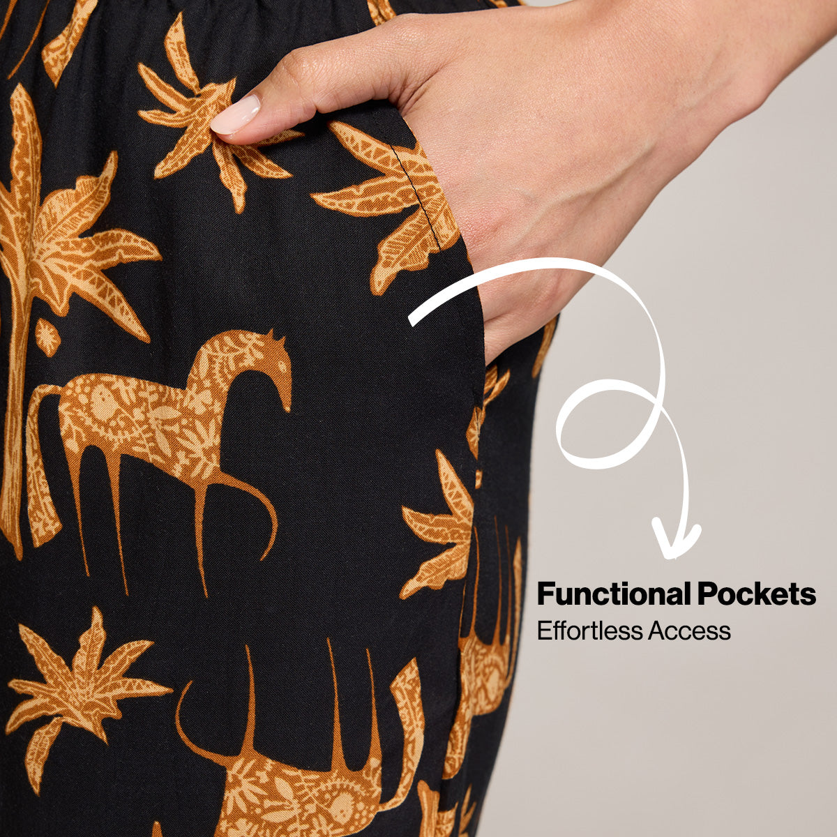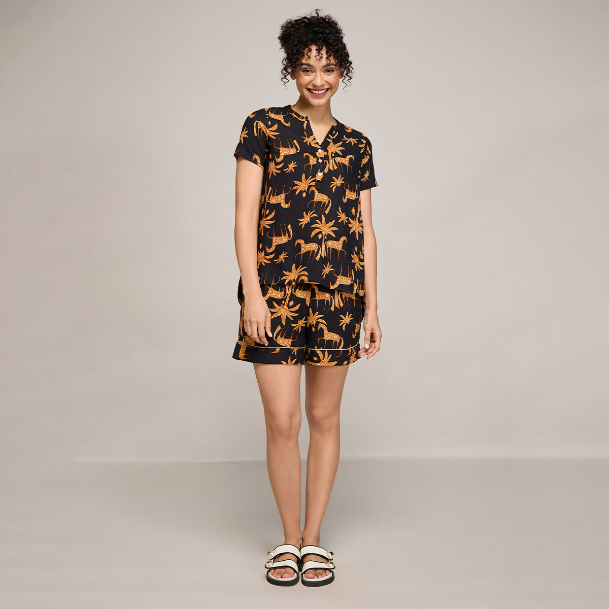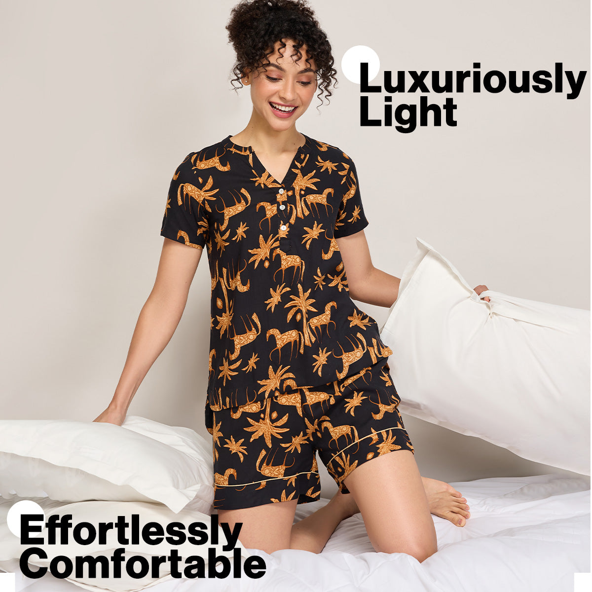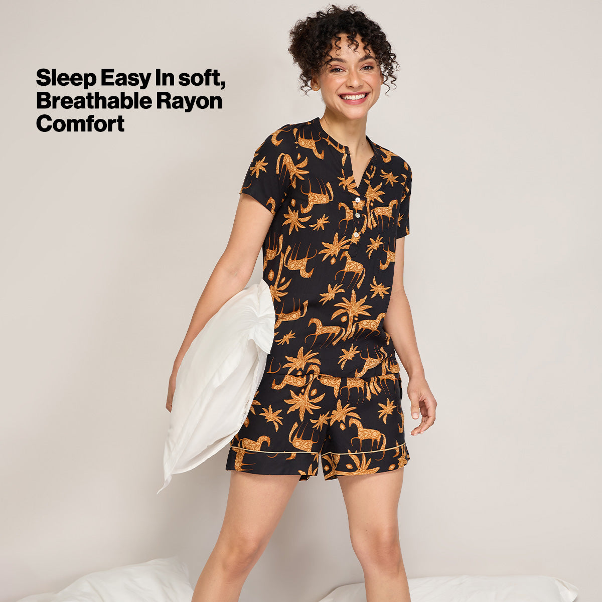 Stay cool and stylish with these printed rayon shorts, featuring vibrant seasonal colors and unique designs. Crafted from breathable 100% rayon fabric, they offer unmatched comfort for lounging or sleeping. The relaxed fit and shorts length ensure easy movement without riding up, while the elasticated waistband with an adjustable drawstring provides a secure, customizable fit. Premium details like contrast piping and a sleek branded patch complete the look with finesse.