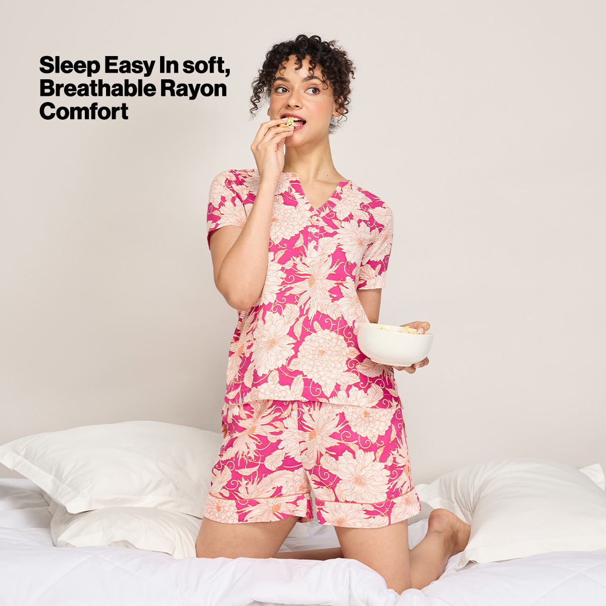 Stay cool and stylish with these printed rayon shorts, featuring vibrant seasonal colors and unique designs. Crafted from breathable 100% rayon fabric, they offer unmatched comfort for lounging or sleeping. The relaxed fit and shorts length ensure easy movement without riding up, while the elasticated waistband with an adjustable drawstring provides a secure, customizable fit. Premium details like contrast piping and a sleek branded patch complete the look with finesse.