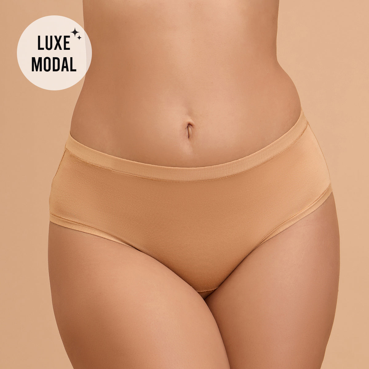 Our signature, buttery-soft hipster panty is made with premium Modal. It is specially designed with luxurious construction with a no-dent, high-stretch waistband and elastic-free legs for distraction-free movement. This ultra breathable, super absorbent, sustainable fabric caresses you like second skin!