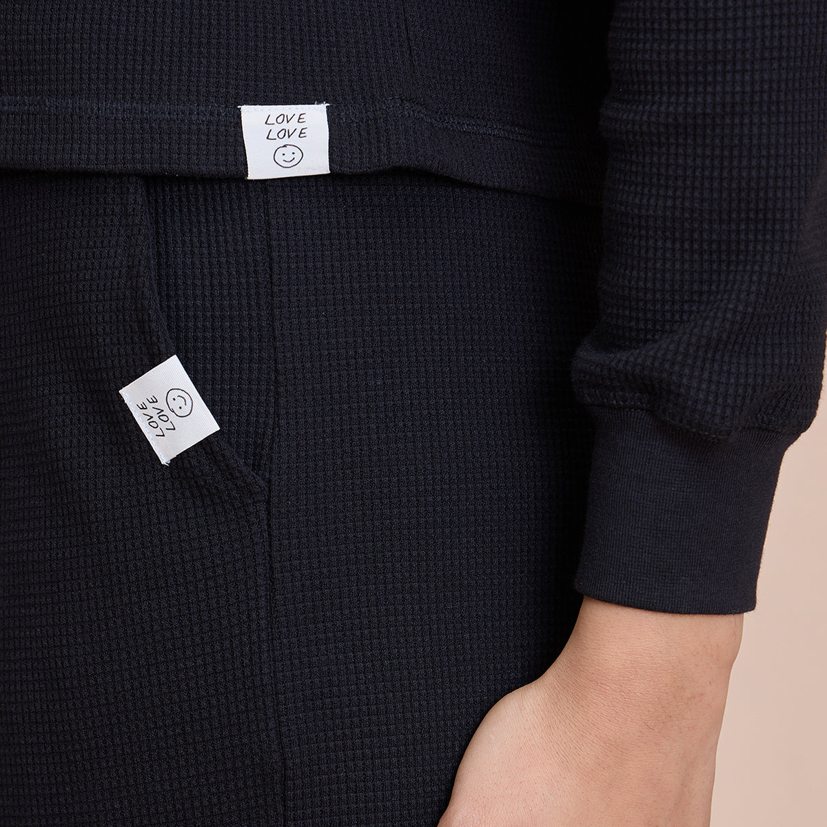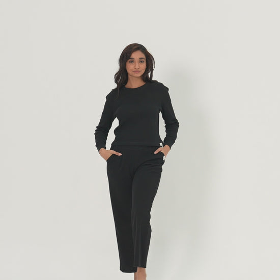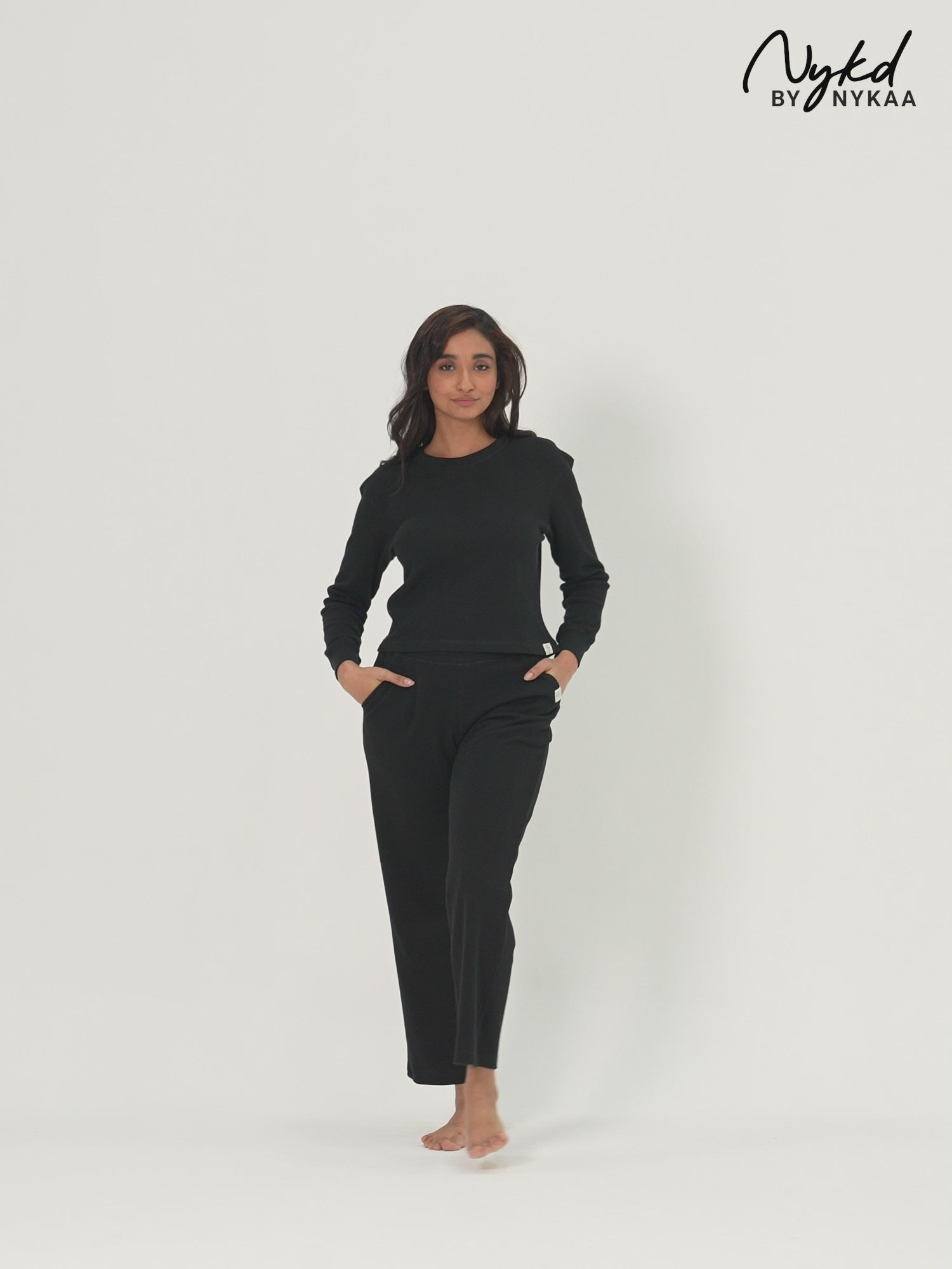 Waffle Lounge Crop Top in Full Sleeves-NYS915-Black